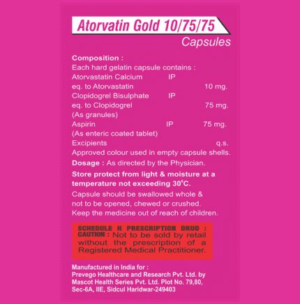 In Prevention of Heart attack Atorvatin Gold 10/75/75 Capsule is a combination medicine that is used to prevent heart attack. It contains Atorvastatin that works by reducing the amount of “bad” cholesterol (LDL) and raising the amount of “good” cholesterol (HDL) in your blood. High levels of cholesterol can cause your blood vessels to narrow (atherosclerosis). Lowering the amount of cholesterol reduces the chances of heart diseases and helps you remain healthier for longer.u003cbr>u003cbr>Besides, it also contains two blood thinners, Aspirin and Clopidogrel, that together prevent the formation of blood clots and also prevent the existing ones from growing bigger in size. Take it regularly and make appropriate lifestyle changes (such as eating healthy and staying active) to maximize the effectiveness of this medicine. Keep taking it even if you feel well.