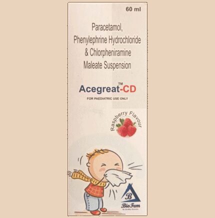 Acegreat-CD Oral Suspension Raspberry is a medicine used in the treatment of common cold symptoms. It provides relief from symptoms such as headache, sore throat, runny nose, muscular pain, and fever. Acegreat-CD Oral Suspension Raspberry can be taken with or without food. The dose and duration will depend on the severity of your condition. You should keep taking the medicine even if you feel better until the doctor says it is alright to stop using it.Using this medicine may cause a few common side effects such as nausea, vomiting, sleepiness, dizziness, and headache. If any of these side effects do not resolve with time or get worse, you should let your doctor know. Your doctor may be able to suggest ways of preventing or reducing the side effects. In general, you should try to use the smallest amount necessary to control your symptoms.Before using the medicine, you should tell your doctor if you have any other medical conditions or disorders. To make sure it is safe, you should let your doctor know all the other medicines you are taking. Also, tell your doctor if you have any problems with the liver or kidneys. Avoid consumption of alcohol while on treatment with this medicine as it may increase the chance of some side effects. Pregnant and breastfeeding women should consult their doctors first before using the medicine.