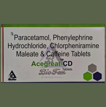 Acegreat-CD Tablet is used to treat common cold symptoms. It provides temporary relief from stuffiness in the nose. It also helps to relieve allergy symptoms like runny nose and watery eyes. Acegreat-CD Tablet is taken with or without food in a dose and duration as advised by the doctor. It is better to take it with food to avoid stomach upset. The dose you are given will depend on your condition and how you respond to the medicine. You should keep taking this medicine for as long as your doctor recommends. If you stop treatment too early your symptoms may come back and your condition may worsen. Let your doctor know about all other medications you are taking as some may affect, or be affected by this medicine.The most common side effects are nausea, vomiting, headache, restlessness, and insomnia. Most of these are temporary and usually resolve with time. Contact your doctor straight away if you are at all concerned about any of these side effects. It can also cause dizziness and sleepiness, so do not drive or do anything that requires mental focus until you know how this medicine affects you. Avoid drinking alcohol while taking this medicine as it can make dizziness worse.Before taking it, you should tell your doctor if you have any kidney or liver diseases so that your doctor can prescribe a suitable dose for you. Also tell your doctor if you are pregnant, planning pregnancy or breastfeeding.