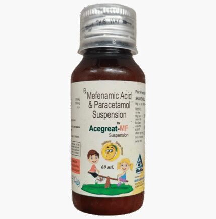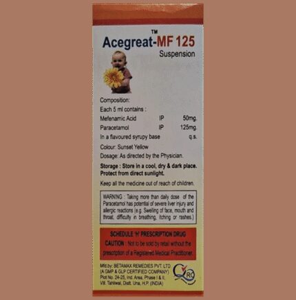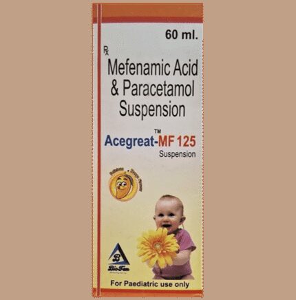 Acegreat-MF 125 Oral Suspension contains two active ingredients both of which belong to a common class of medicines known as non-steroidal anti-inflammatory drugs (NSAIDs). It helps to lower body temperature (fever) and reduce pain and inflammation (redness and swelling) both in infants and children. Adhere to the prescribed dose, time, and way while giving Acegreat-MF 125 Oral Suspension to your child. Give it orally, preferably at a fixed time. It can be given before or after food, but giving it after food helps prevent the chance of developing an upset stomach. If your child vomits within 30 minutes of taking this medicine, give the same dose again. Avoid giving more than the recommended dose for fast relief as that may cause unwanted effects in your child.Some children develop certain mild side effects like nausea, vomiting, stomach pain, heartburn, and diarrhea after taking this medicine. In case your child develops these side effects, do not worry as these are mostly temporary and resolve on their own. But, if these effects persist or become bothersome for your child, do consult your child’s doctor on a priority basis.Before giving Acegreat-MF 125 Oral Suspension to your child, do inform the doctor if your child is allergic to any medicine or products or has a history of any heart problems, birth defects, liver disease, kidney disease, lung disease, or bleeding disorder. This information is critical for dose alteration and helps in planning your child's overall treatment.