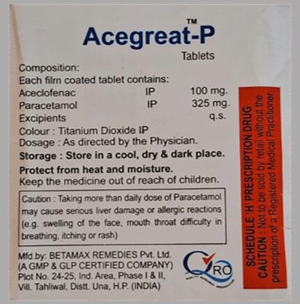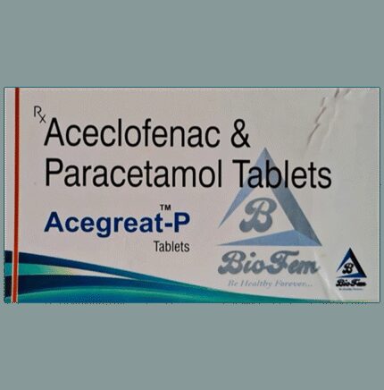 Acegreat-P Tablet is a pain-relieving medicine. It is used to reduce pain and inflammation in conditions like rheumatoid arthritis, ankylosing spondylitis, and osteoarthritis. It may also be used to relieve muscle pain, back pain, toothache, or pain in the ear and throat. Acegreat-P Tablet should be taken with or without food. You should take it regularly as advised by your doctor. Your doctor may change the dose and time between doses according to your pain level and your needs. Do not take more or use it for a longer duration than recommended by your doctor.Some of the common side effects of this medicine include nausea, vomiting, stomach pain, heartburn, and diarrhea. If any of these side effects bother you or do not go away with time, you should let your doctor know. Your doctor may help you with ways to reduce or prevent these side effects by prescribing an alternative medicine or adjusting the dose.Acegreat-P Tablet may not be suitable for everybody. Before taking it, let your doctor know if you have any problems with your heart, kidneys, liver, or have stomach ulcers. To make sure it is safe for you, let your doctor know about all the other medicines you are taking. Pregnant and breastfeeding mothers should first consult their doctors before using Acegreat-P Tablet.