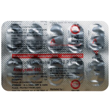 In Pain relief Auspyratic 650 Tablet DT is a common painkiller used to treat aches and pains. It works by blocking chemical messengers in the brain that tell us we have pain. It is effective in relieving pain caused by headache, migraine, nerve pain, toothache, sore throat, period (menstrual) pains, arthritis, and muscle aches. This medicine is very widely used and very rarely causes side effects if taken at the right dosage. Take it as it is prescribed to get the most benefit. Do not take more or for longer than needed as that can be dangerous. In general, you should take the lowest dose that works, for the shortest possible time. It is also the first choice of painkiller during pregnancy or breastfeeding.