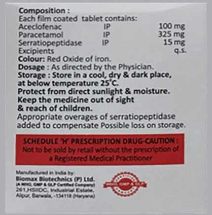 Aceim SP 100mg/325mg/15mg Tablet is a combination medicine used to relieve pain and swelling in various conditions like muscle pain, joint pain, and postoperative pain. Thus, it effectively alleviates pain and inflammation in conditions like rheumatoid arthritis, ankylosing spondylitis, and osteoarthritis. Aceim SP 100mg/325mg/15mg Tablet should be taken in the dose and duration as advised by your doctor. It should be taken with food or milk to prevent stomach upset. Taking the medicine regularly at the right times increases its effectiveness. It is important to keep taking the medicine regularly until your doctor tells you it is safe to stop.Nausea, vomiting, stomach pain, indigestion, heartburn, increased liver enzymes, dizziness,drowsiness, and diarrhea are some of the common side effects that might be observed on taking this medicine. Your doctor may regularly monitor your kidney function, liver function, and levels of blood components if you are taking this medicine for long-term treatment. Long-term use may lead to serious complications such as stomach bleeding and kidney problems. Aceim SP 100mg/325mg/15mg Tablet is not recommended if you are pregnant or breastfeeding.