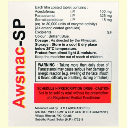 In Pain relief Awsnac-SP Tablet is a combination medicine used for short-term relief of pain, inflammation, and swelling in conditions affecting joints and muscles. It works by blocking chemical messengers in the brain that tell us we have pain. It can help relieve pain in conditions like rheumatoid arthritis and osteoarthritis. Along with painkillers, this medicine also contains an active ingredient called Serratiopeptidase, which is an enzyme that promotes the overall healing process and speeds up recovery.u003cbr>u003cbr>Take it as it is prescribed to get the most benefit. Do not take more or longer than needed as that can be dangerous. In general, you should take the lowest dose that works, for the shortest possible time. This will help you to go about your daily activities more easily and have a better, more active, quality of life.