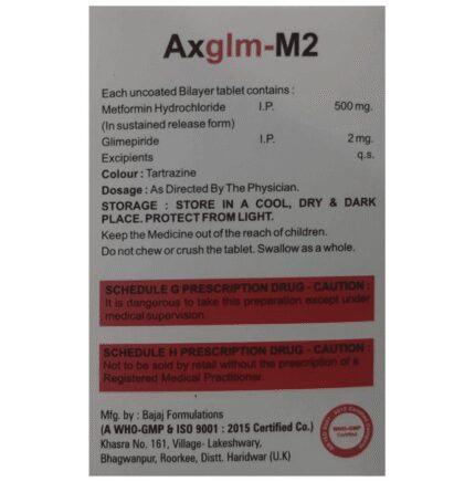 In Treatment of Type 2 diabetes mellitus Axglm-M2 Tablet SR is a combination medicine that increases the amount of insulin your body produces (in the pancreas). The insulin then works to lower your blood glucose level. It is usually taken once a day. You should keep taking it for as long as it is prescribed.u003cbr>Lowering blood glucose levels is an essential part of managing diabetes. If you can control the level you will reduce the risk of getting any of the serious complications of diabetes such as kidney damage, eye damage, nerve problems, and loss of limbs. Taking this medicine regularly along with proper diet and exercise will help you live a normal, healthy life.