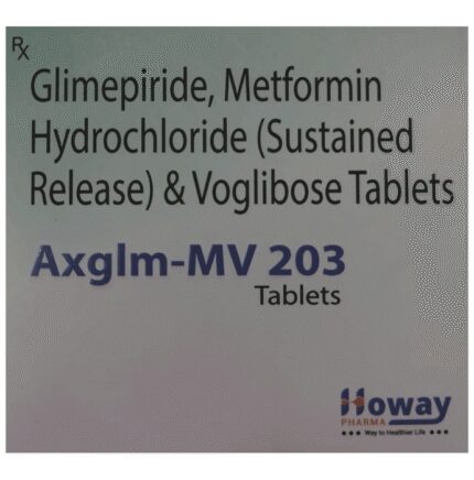 In Treatment of Type 2 diabetes mellitus Axglm-MV 203 Tablet SR is a medicine that helps to control high blood glucose (sugar) levels. It helps to slow down the breaking down of food in our intestine to simple glucose (sugar), thereby decreasing the rise in blood glucose levels after meals. It also helps get rid of extra glucose from your body through urine. Lowering blood glucose levels is an essential part of managing diabetes. If you can control the level, you will reduce the risk of getting any of the serious complications of diabetes such as kidney damage, eye damage, nerve problems and loss of limbs. u003cbr>Axglm-MV 203 Tablet SR will reduce the risk of dying from cardiovascular disease if you have type 2 diabetes and already have cardiovascular disease. Taking this medicine regularly along with proper diet and exercise will help you live a normal, healthy life. You should keep using it for as long as it is prescribed because it is protecting your future health.