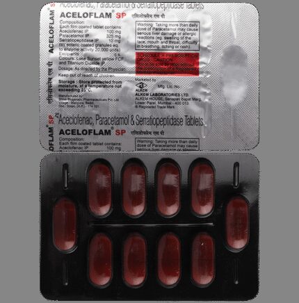 Aceloflam SP Tablet is a combination medicine used to relieve pain and swelling in various conditions like muscle pain, joint pain, and postoperative pain. Thus, it effectively alleviates pain and inflammation in conditions like rheumatoid arthritis, ankylosing spondylitis, and osteoarthritis. Aceloflam SP Tablet should be taken in the dose and duration as advised by your doctor. It should be taken with food or milk to prevent stomach upset. Taking the medicine regularly at the right times increases its effectiveness. It is important to keep taking the medicine regularly until your doctor tells you it is safe to stop.Nausea, vomiting, stomach pain, indigestion, heartburn, increased liver enzymes, dizziness,drowsiness, and diarrhea are some of the common side effects that might be observed on taking this medicine. Your doctor may regularly monitor your kidney function, liver function, and levels of blood components if you are taking this medicine for long-term treatment. Long-term use may lead to serious complications such as stomach bleeding and kidney problems. Aceloflam SP Tablet is not recommended if you are pregnant or breastfeeding.