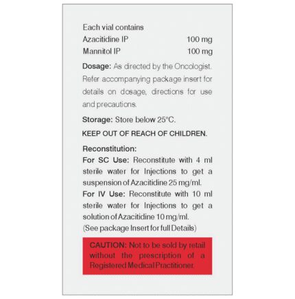 In Blood cancer Blood cancer, also called leukemia, is a cancer of the blood-forming tissues, that decreases the body's ability to fight infection. Azacitidine 100mg Injection kills or stops the growth of cancer cells and also prevents the multiplication of cancer cells. It is a potent and very toxic medicine and you should discuss the risks and benefits with your doctor. You should avoid drinking alcohol while having this treatment and drink plenty of water to stay hydrated.