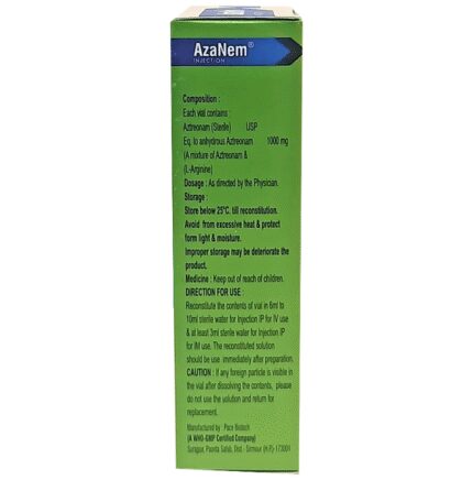In Severe bacterial infections Azanem Injection works by killing bacteria which can cause serious infections. It is used to treat many different types of bacterial infections such as infections of lungs (pneumonia), blood, brain, ear, skin, and soft tissue, abdomen, bone, windpipe and urinary tract. It is given by a doctor or nurse into a vein and should not be self-administered. Azanem Injection usually makes you feel better very quickly but you should continue taking it as prescribed even when you feel better to make sure that all bacteria are killed and do not become resistant.