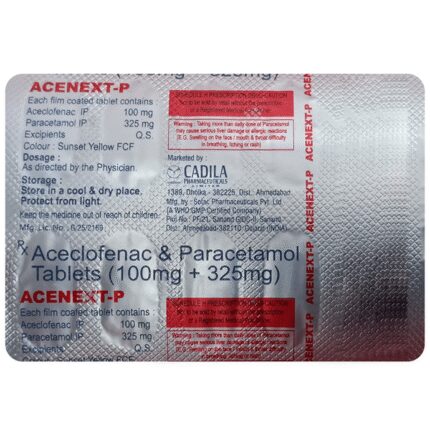 Acenext P 100mg/325mg Tablet is a pain-relieving medicine. It is used to reduce pain and inflammation in conditions like rheumatoid arthritis, ankylosing spondylitis, and osteoarthritis. It may also be used to relieve muscle pain, back pain, toothache, or pain in the ear and throat. Acenext P 100mg/325mg Tablet should be taken with or without food. You should take it regularly as advised by your doctor. Your doctor may change the dose and time between doses according to your pain level and your needs. Do not take more or use it for a longer duration than recommended by your doctor.Some of the common side effects of this medicine include nausea, vomiting, stomach pain, heartburn, and diarrhea. If any of these side effects bother you or do not go away with time, you should let your doctor know. Your doctor may help you with ways to reduce or prevent these side effects by prescribing an alternative medicine or adjusting the dose.Acenext P 100mg/325mg Tablet may not be suitable for everybody. Before taking it, let your doctor know if you have any problems with your heart, kidneys, liver, or have stomach ulcers. To make sure it is safe for you, let your doctor know about all the other medicines you are taking. Pregnant and breastfeeding mothers should first consult their doctors before using Acenext P 100mg/325mg Tablet.