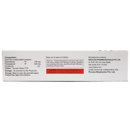 Acentio SP 100mg/325mg/15mg Tablet is a combination medicine used to relieve pain and swelling in various conditions like muscle pain, joint pain, and postoperative pain. Thus, it effectively alleviates pain and inflammation in conditions like rheumatoid arthritis, ankylosing spondylitis, and osteoarthritis. Acentio SP 100mg/325mg/15mg Tablet should be taken in the dose and duration as advised by your doctor. It should be taken with food or milk to prevent stomach upset. Taking the medicine regularly at the right times increases its effectiveness. It is important to keep taking the medicine regularly until your doctor tells you it is safe to stop.Nausea, vomiting, stomach pain, indigestion, heartburn, increased liver enzymes, dizziness,drowsiness, and diarrhea are some of the common side effects that might be observed on taking this medicine. Your doctor may regularly monitor your kidney function, liver function, and levels of blood components if you are taking this medicine for long-term treatment. Long-term use may lead to serious complications such as stomach bleeding and kidney problems. Acentio SP 100mg/325mg/15mg Tablet is not recommended if you are pregnant or breastfeeding.