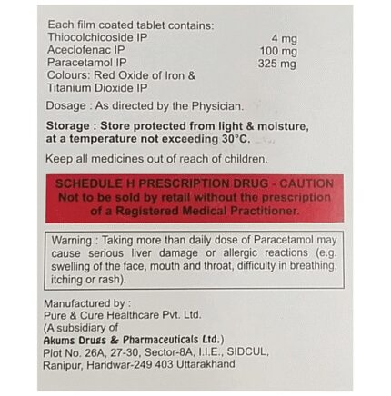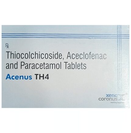 Acenus TH4 Tablet is a combination medicine that helps in relieving muscular pain. It works by blocking the release of certain chemical messengers that cause pain, inflammation, and fever. This improves the movement of muscles and provides relief from pain and discomfort. Acenus TH4 Tablet should be taken with food. This will prevent you from getting an upset stomach. The dose and duration will depend on the severity of your condition. You should keep taking the medicine even if you feel better until the doctor says it is alright to stop using it.Using this medicine may cause few common side effects such as nausea, vomiting, heartburn, stomach pain, diarrhea, loss of appetite, and dryness in the mouth. If any of these side effects do not resolve with time or get worse, you should let your doctor know. Your doctor may be able to suggest ways of preventing or reducing the side effects. In general, you should try to use the smallest amount necessary to control your symptoms.Before using the medicine, you should tell your doctor if you have any other medical conditions or disorders. To make sure it is safe, you should let your doctor know all the other medicines you are taking. Also, tell your doctor if you have any problems with your liver or kidneys. You should avoid the consumption of alcohol while on treatment with this medicine. Pregnant and breastfeeding women should consult their doctors first before using the medicine.