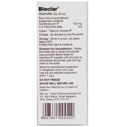 In Treatment of Bacterial infections Bioclar 125mg Suspension is an antibiotic medicine that can be used to treat many different infections caused by bacteria. These include infections of the respiratory tract, ear, nose, throat, lungs, and skin. It is also effective against a bacteria known as H. pylori, which is associated with peptic ulcer disease. It stops further growth of the bacteria causing the infection and helps treat your infection.u003cbr>u003cbr>This medicine usually makes you feel better quite quickly. However, you should continue taking it as long as it is prescribed even when you feel better, to make sure that all bacteria are killed and do not become resistant.