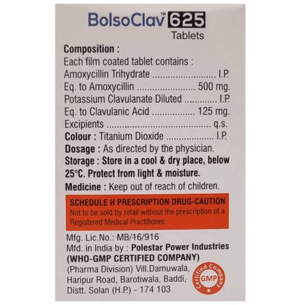 In Treatment of Bacterial infections Bolsoclav 625 Tablet contains two medicines, Amoxycillin and Clavulanic Acid, that work together to kill the bacteria that cause infections. Amoxycillin works by stopping the growth of bacteria. Clavulanic Acid reduces resistance and enhances the activity of Amoxycillin against bacteria.u003cbr>Bolsoclav 625 Tablet can treat many bacterial infections such as ear, sinus, throat, lung, urinary tract, skin, teeth, joints, and bones. It usually makes you feel better within a few days, but you should continue taking it as prescribed even when you feel better to ensure all bacteria are killed and do not become resistant.