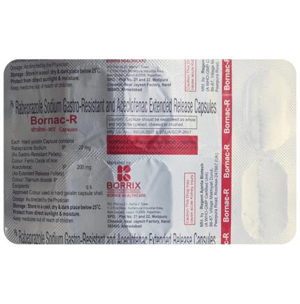 In Pain relief Bornac-R Capsule ER is a combination medicine used for short-term relief of pain, inflammation, and swelling in conditions that affect joints and muscles. It can help relieve pain in conditions like rheumatoid arthritis and osteoarthritis. But, this pain-relieving action may damage the inner lining of the stomach. Therefore, this medicine also has an active ingredient called Rabeprazole, which reduces the acid secretion in our stomach, thereby reducing the damage caused by the painkillers.u003cbr>u003cbr>Take it as it is prescribed to get the most benefit. Do not take more or for a longer duration than needed as that can be dangerous. In general, you should take the lowest dose that works, for the shortest possible time. This will help you to go about your daily activities more easily and have a better, more active, quality of life.