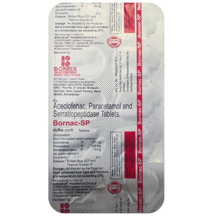 In Pain relief Bornac-SP Tablet is a combination medicine used for short-term relief of pain, inflammation, and swelling in conditions affecting joints and muscles. It works by blocking chemical messengers in the brain that tell us we have pain. It can help relieve pain in conditions like rheumatoid arthritis and osteoarthritis. Along with painkillers, this medicine also contains an active ingredient called Serratiopeptidase, which is an enzyme that promotes the overall healing process and speeds up recovery.u003cbr>u003cbr>Take it as it is prescribed to get the most benefit. Do not take more or longer than needed as that can be dangerous. In general, you should take the lowest dose that works, for the shortest possible time. This will help you to go about your daily activities more easily and have a better, more active, quality of life.