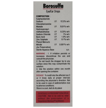 In Treatment of Bacterial eye infections Borosulfa Eye/Ear Drop stops the growth of bacteria causing infection and helps relieve pain, swelling, and redness. It also gives relief from teary eyes, itching or irritation in the eyes. Use it for as long as your doctor has prescribed it. Your symptoms might improve after using Borosulfa Eye/Ear Drop. However, make sure to complete the full course of treatment. This will ensure that the infection is completely cured and prevent it from returning.