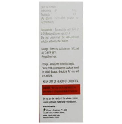Marketer:Alpine Lifescience Private Limited,Composition:Bortezomib (2mg), medicine_typedrugs,Packaging Detail:vial of 1 Injection,          Package:Vial,Qty:1,Product Form:Injection,
