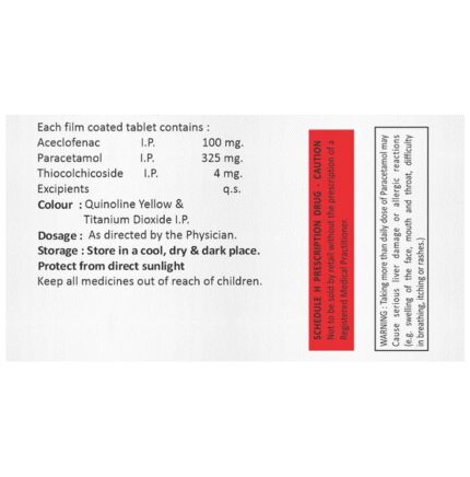 Acevil TH Tablet is a combination medicine used in the treatment of pain due to muscle spasms. It improves the movement of muscles and provides relief from pain and discomfort associated with muscle spasms. Acevil TH Tablet should be taken with food. This will prevent you from getting an upset stomach. You should take it regularly as advised by your doctor. Do not take more or use it for a longer duration than recommended by your doctor.Some of the common side effects of this medicine include nausea, vomiting, heartburn, stomach pain, loss of appetite, and diarrhea. If any of these side effects bother you or do not go away with time, you should let your doctor know. Your doctor may help with ways to reduce or prevent these side effects.The medicine may not be suitable for everybody. Before taking it, let your doctor know if you have any problems with your heart, kidneys, and liver. To make sure it is safe for you, let your doctor also know all the other medicines you are taking. Pregnant and breastfeeding mothers should first consult their doctors before using the medicine.