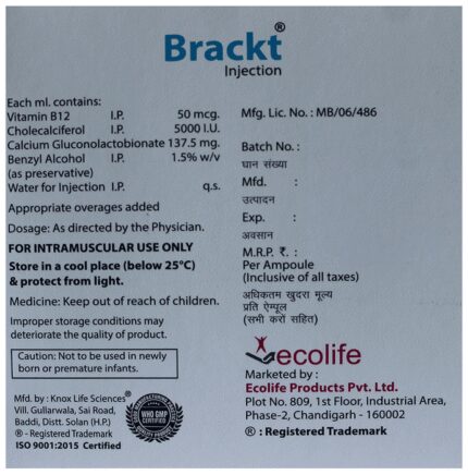 In Nutritional deficiencies Brackt Injection is a nutritional supplement that is used to prevent or treat low blood calcium levels in people who do not get enough calcium from their diets. It also improves the level of vitamin D in your blood which in turn helps in absorption of more calcium from your intestine. This will help to keep your bones strong and healthy and reduce the risk of any bone disorders like osteoporosis. Brackt Injection also helps in the formation of red blood cells and enhances the absorption of iron in the body. Brackt Injection is given as an injection by a doctor or nurse.