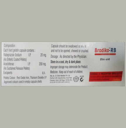 In Pain relief Bradika-RB Capsule SR is a combination medicine used for short-term relief of pain, inflammation, and swelling in conditions that affect joints and muscles. It can help relieve pain in conditions like rheumatoid arthritis and osteoarthritis. But, this pain-relieving action may damage the inner lining of the stomach. Therefore, this medicine also has an active ingredient called Rabeprazole, which reduces the acid secretion in our stomach, thereby reducing the damage caused by the painkillers.u003cbr>u003cbr>Take it as it is prescribed to get the most benefit. Do not take more or for a longer duration than needed as that can be dangerous. In general, you should take the lowest dose that works, for the shortest possible time. This will help you to go about your daily activities more easily and have a better, more active, quality of life.