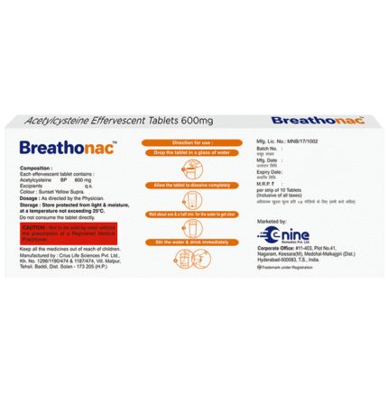 In Treatment of Respiratory disease with excessive mucus Breathonac Effervescent Tablet Orange Sugar Free helps to loosen thick mucus, making it easier to cough out. This makes it easier for air to move in and out. It will relieve symptoms such as tightness in your chest, shortness of breath, wheezing, and coughing and help you carry out your daily activities more easily. This medicine is safe and effective. It usually starts to work within a few minutes and the effects can last up to several hours. Take it as prescribed by the doctor. Do not stop using it unless you are advised to by your doctor. Taking this medicine enables you to live your life more freely without worrying so much about things that set off your symptoms.