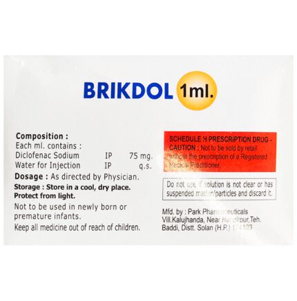 In Pain relief Brikdol 75mg Injection belongs to a group of medicines called nonsteroidal anti-inflammatory drugs (NSAIDs). It is used for short-term relief of pain, inflammation, and swelling in conditions that affect joints and muscles. It works by blocking chemical messengers in the brain that tell us we have pain. It can help relieve pain in conditions like rheumatoid arthritis and osteoarthritis.u003cbr>u003cbr>Take it as it is prescribed to get the most benefit. Do not take more or longer than needed as that can be dangerous. In general, you should take the lowest dose that works, for the shortest possible time. This will help you to go about your daily activities more easily and have a better, more active, quality of life.