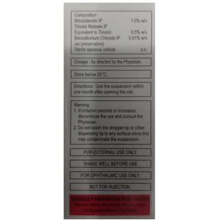 In Ocular hypertension Brinzox Ophthalmic Suspension belongs to a group of medicines called carbonic anhydrase inhibitors. It is used to reduce pressure in your eyes. If the pressure in your eye is too high, it can damage your sight. You should only use it in the affected eye and take it regularly as prescribed by your doctor. If you stop taking it, the pressure in your eye will not be controlled. This could lead to a loss of sight.