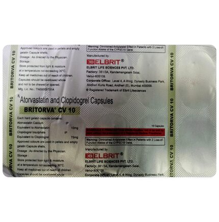 In Heart attack prevention and high cholesterol Britorva CV 10mg/75mg Capsule is a combination medicine that is used to prevent heart attack. It contains Atorvastatin that works by reducing the amount of “bad” cholesterol (LDL) and raising the amount of “good” cholesterol (HDL) in your blood. High levels of cholesterol can cause your blood vessels to narrow (atherosclerosis). Lowering the amount of cholesterol reduces the chances of heart diseases and helps you remain healthier for longer. u003cbr>Besides, it also contains a blood thinner, Clopidogrel, that prevents the formation of blood clots and also prevents the existing ones from growing bigger in size. Take it regularly and make appropriate lifestyle changes (such as eating healthy and staying active) to maximize the effectiveness of this medicine. Keep taking it even if you feel well.