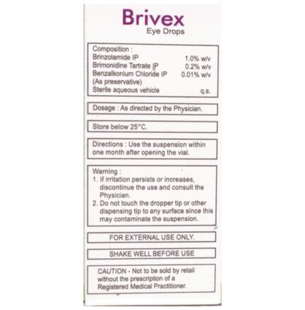 In Treatment of Glaucoma Glaucoma is an eye disease that damages the optic nerve which is essential for proper vision. This damage is often caused by an abnormally high pressure in the eye. Brivex Eye Drop is used to reduce swelling and pressure inside the eye. This helps prevent complications of glaucoma such as blindness and improves the vision. This medicine may be used alone or with other eye drops. Glaucoma cannot be prevented. Frequent monitoring, regular checkups can help detect the disease in its early stages.