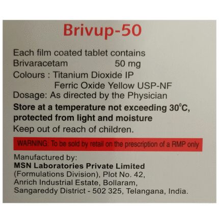 In Epilepsy/Seizures Brivup 50 Tablet belongs to a group of medicines called anticonvulsants (or anti-epileptics). It works by slowing down electrical signals in the brain which cause seizures (fits). This medicine can be used to control the various types of seizures—myoclonic, partial-onset, and primary generalized tonic-clonic (or grand mal). It can also help reduce symptoms such as confusion, uncontrollable jerking movements, loss of awareness, and fear or anxiety. u003cbr>u003cbr>The medicine can allow you to do some activities that you would otherwise be forbidden or scared to do (such as swimming and driving). It can take a few weeks for this medicine to work (because the dose has to be increased slowly) and during this time you may still have seizures. You should continue taking it even if you feel well and are not having any seizures. Missing doses may trigger a seizure. Do not stop using this medicine until your doctor advises you.