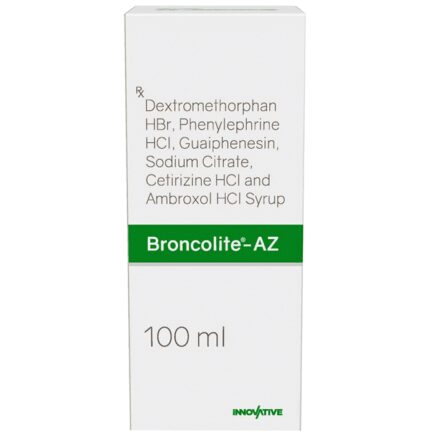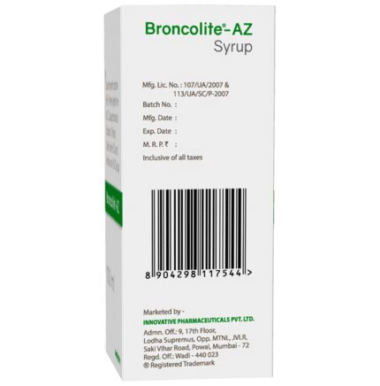 In Cough Broncolite-AZ Syrup gives relief from cough by loosening thick mucus and making it easier to cough it out. It also makes it easier for air to move in and out of your airways. This reduces the frequency of coughing and makes you feel better. Broncolite-AZ Syrup also relieves allergy symptoms like watery eyes, sneezing, runny nose or throat irritation. Along with medications, drink enough lukewarm water and gargle with warm salt water to ease the symptoms.