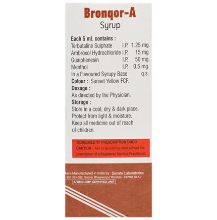 In Cough Bronqor-A Syrup gives relief from cough by loosening thick mucus and making it easier to cough it out. It also makes it easier for air to move in and out of your airways. This reduces the frequency of coughing and makes you feel better. Bronqor-A Syrup also soothes your throat and gives relief from irritation. Along with medications, drink enough luke warm water and gargle with warm salt water to ease the symptoms.