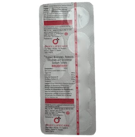 In Pain relief Bruditryp Tablet relieves pain, reduce swelling and ease inflammation in conditions like rheumatoid arthritis, osteoarthritis and ankylosing spondolytis. It also gives relief from muscle and back pain, toothache, or pain in the ear and throat. It works by reducing substances in the body that causes pain and swelling. Take it as prescribed to get the most benefit. This will help you to go about your daily activities more easily and have a better, more active, quality of life.