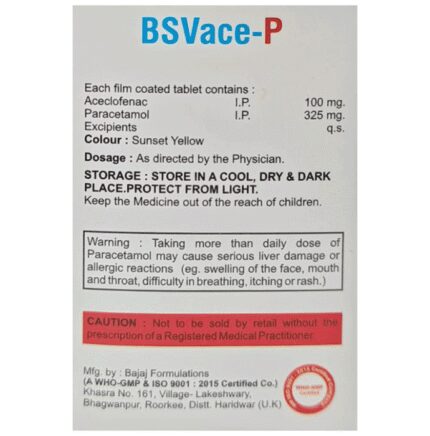 In Pain relief Bsvace-P Tablet is used for short-term relief of pain, inflammation, and swelling in conditions that affect joints and muscles. Some of the conditions in which Bsvace-P Tablet is used are rheumatoid arthritis, osteoarthritis, muscle pain, back pain, toothache, or pain in the ear and throat. Take it as it is prescribed to get the most benefit. Do not take more or longer than needed as that can be dangerous. In general, you should take the lowest dose that works, for the shortest possible time. This will help you to go about your daily activities more easily and have a better, more active, quality of life.