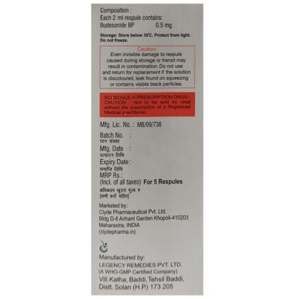 Marketer:Clyde Pharmaceuticals Pvt Ltd,Composition:Budesonide (0.5mg/2ml), medicine_typedrugs,Packaging Detail:packet of 5 nebulisers,                   Package:Packet,Qty:5,Product Form:Nebuliser,
