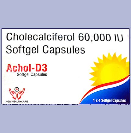 Achol-D3 Softgel Capsule is used to treat vitamin D deficiency and osteoporosis. It helps the body absorb calcium, which is essential for maintaining strong and healthy bones. It is used when the diet does not provide enough. Achol-D3 Softgel Capsule should be taken as directed by your doctor. It is best taken with or after food as this helps your body absorb it, and you should take it regularly to get the most benefit. If you are using it to treat osteoporosis, you will also be prescribed other medicines. This medicine may be only part of a complete treatment program that includes making changes to your diet and taking calcium and vitamin supplements. Learn about the foods you should eat to ensure you get enough calcium and vitamin D.Achol-D3 Softgel Capsule has few side effects, and none are common. If you take too much, you may feel weakness, muscle pain, or a metallic taste in your mouth. If you experience any such side effects, speak with your doctor. They may be able to help you reduce or treat the symptoms.Before taking this medicine, tell your doctor if you have high calcium levels in your blood or if you have any heart, kidney, or liver disease. Some other medicines can decrease the absorption of vitamin D3, so let your doctor know all other medicines you are taking to make sure you are safe. This medicine may help during pregnancy when your body needs more vitamin D, but too much could harm your baby. Discuss with your doctor.