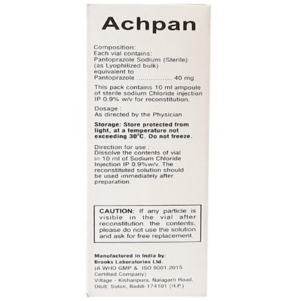 Achpan Injection is a medicine that reduces the amount of acid produced in your stomach. It is used for treating acid-related diseases of the stomach and intestine such as acid reflux, peptic ulcer disease, Zollinger-Ellison syndrome. It provides relief from symptoms and promotes healing. Achpan Injection is also used to prevent stress ulcers in seriously ill patients and is administered before anesthetic medication to help prevent aspiration-related complications. It belongs to a class of medicines known as proton pump inhibitors (PPIs). This medicine is administered into a vein by a healthcare professional and will only be given to you if your doctor thinks that an injection is more suitable for you at the moment than a tablet. The dose will depend on your underlying condition and how you respond to the medicine. Your doctor will decide the duration of treatment but you should keep on taking it as prescribed, even if your symptoms disappear quickly. You can increase the efficiency of the treatment by eating smaller meals more often and avoiding caffeinated drinks (like tea and coffee), and spicy or fatty foods.The most common side effects observed with this medicine include nausea, vomiting, headache, dizziness, flatulence, diarrhea, stomach pain, and thrombophlebitis (pain, redness, and swelling of the vein). These symptoms are generally mild but if they bother you or do not go away, consult your doctor. Long-term use of this medicine may lead to an increased risk of side effects. For instance, using this medicine for more than 1 year may increase your risk for bone fractures, especially with higher doses. Talk to your doctor about ways to prevent bone loss (osteoporosis), like taking calcium and vitamin D supplements.Achpan Injection is not suitable for some people. Before taking this medicine, you need to tell your doctor if you have severe liver problems, are taking medicines for HIV, have ever had an allergic reaction to similar medicines in the past, or suffer from bone loss (osteoporosis). Pregnant or breastfeeding women should also consult their doctor before taking it. Avoid drinking alcohol as it makes your stomach produce excessive acid and can worsen your symptoms. Do not drive or use machinery or tools, if this medicine makes you feel dizzy or sleepy.