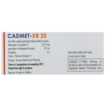 In Treatment of Angina (heart-related chest pain) Cadmet 25mg Tablet XR relaxes the blood vessels so that blood can flow more easily around your body and makes sure that your heart is getting a good supply of oxygen. This makes it less likely that you will suffer chest pain caused by angina. This medicine can help increase your ability to exercise and go about your daily life more easily by reducing the frequency of angina attacks. You should take it regularly and as long as it is prescribed for it to work effectively.