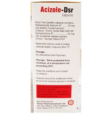 Acizole-DSR Capsule is a combination medicine used to treat gastroesophageal reflux disease (Acid reflux). It works by relieving the symptoms of acidity such as heartburn, stomach pain, or irritation. It also neutralizes the acid and promotes easy passage of gas to reduce stomach discomfort.Acizole-DSR Capsule is taken without food in a dose and duration as advised by the doctor. The dose you are given will depend on your condition and how you respond to the medicine. You should keep taking this medicine for as long as your doctor recommends. If you stop treatment too early your symptoms may come back and your condition may worsen. Let your healthcare team know about all other medications you are taking as some may affect, or be affected by this medicine.The most common side effects are diarrhea, stomach pain, dryness in the mouth, headache, flatulence, and weakness. Most of these are temporary and usually resolve with time. Contact your doctor straight away if you are at all concerned about any of these side effects. This medicine may cause dizziness and sleepiness, so do not drive or do anything that requires mental focus until you know how this medicine affects you. Avoid drinking alcohol while taking this medicine as it can worsen your sleepiness. Lifestyle modifications like having cold milk and avoiding hot tea, coffee, spicy food or chocolate can help you to get better results.Before you start taking this medicine it is important to inform your doctor if you are suffering from kidney or liver disease. You should also tell your doctor if you are pregnant, planning pregnancy or breastfeeding.