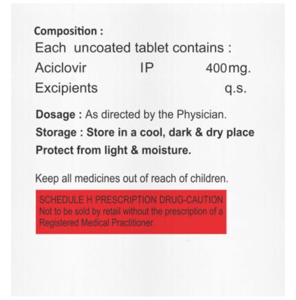 Aclovil 400 Tablet is an antiviral medicine. It helps in treating viral infections like herpes labialis, herpes simplex, shingles, genital herpes infection, and chickenpox. It prevents the multiplication of virus in human cells and therefore helps in clearing the infection. Aclovil 400 Tablet should be taken in the dose and duration as advised by your doctor. Do not skip any doses and finish the full course of treatment even if you feel better. Dissolve it in a glass of water before taking it. It may be taken with or without food, but it is better to take it at a fixed time. If you miss a dose, take it as soon as possible. However, if it is almost time for your next dose, skip the missed dose and go back to your regular schedule. Do not double the dose. You should drink plenty of water while on treatment with this medicine as it helps to prevent dehydration and kidney damage.Some side effects of this medicine include headache, dizziness, vomiting, nausea, fatigue, and fever. Inform your doctor if these side effects do not resolve or persist for a longer duration. Please consult your doctor if you are pregnant, planning to conceive or breastfeeding.