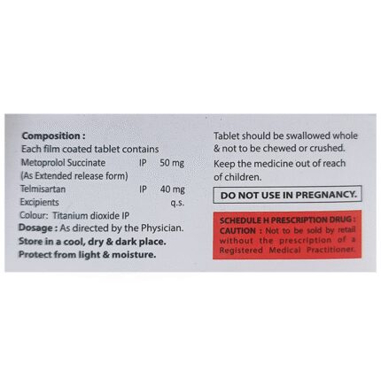 Acmetel-MT 50 Tablet ER is a medicine used for treating high blood pressure. By lowering blood pressure, it helps in preventing future heart attacks and strokes. Early treatment with this medicine also improves the chances of survival in patients with heart attacks.It is advised to take Acmetel-MT 50 Tablet ER with food at a fixed time each day to maintain consistent levels of medicine in the blood. Keep taking it for as long as advised by your doctor. Even if you feel well, do not stop this medicine on your own because high blood pressure often has no symptoms. If you stop taking it, your condition may get worse. Keeping active with regular exercise, reducing your weight and eating a healthy diet will also help control your blood pressure. Follow your doctor’s advice while taking this medicine.Some common side effects of this medicine include headache, weakness, dizziness, decreased blood pressure, increased potassium level in blood, orthostatic hypotension (occasionally with syncope), breathlessness, nausea, vomiting, abdominal pain, and fatigue. It is advised to avoid potassium rich food and supplements while taking this medicine. It may cause dizziness, avoid driving or rise slowly from the sitting position. You may be asked for regular monitoring of blood pressure, blood sugar level, kidney functioning, urea, or electrolytes level during the treatment.Before taking it, let your doctor know if you have any liver or kidney problems. Pregnant or breastfeeding women should also consult their doctor for advice before taking this medicine. You also need to tell your doctor what other medicines you are taking especially those used to treat high blood pressure or heart conditions.