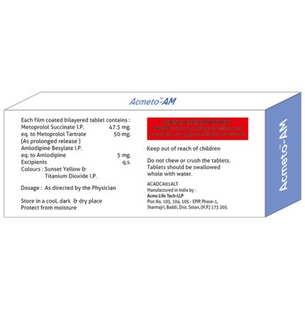Acmeto AM 5mg/50mg Tablet contains two medicines, both of which help to control high blood pressure and heart rate. It is also used for heart-related chest pain (angina), abnormal heart rhythms and chronic (long-term) heart failure. You can take Acmeto AM 5mg/50mg Tablet at any time of day, with or without food, but it is best to take it at the same time each day. Keep taking it for as long as advised by your doctor. Even if you feel well, do not stop this medicine on your own because high blood pressure often has no symptoms. If you stop taking it, your condition may get worse. Keeping active with regular exercise, reducing your weight and eating a healthy diet will also help control your blood pressure. Follow your doctor’s advice while taking this medicine.It may cause side effects like headache, ankle swelling, skin rash, slow heart rate, nausea,a nd depression. It may also cause dizziness, so do not drive or do anything that requires mental focus until you know how this medicine affects you. This might raise the level of potassium in the blood, hence avoid potassium rich food or supplements. You may be asked for regular monitoring of blood pressure, kidney function, and electrolytes level while on the treatment.Before taking it, let your doctor know if you have any liver or kidney problems. Pregnant or breastfeeding women should also consult their doctor for advice before taking this medicine. You also need to tell your doctor what other medicines you are taking especially those used to treat high blood pressure or heart conditions.