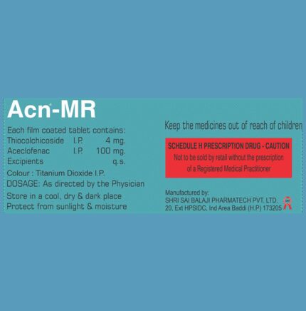 Acn-MR Tablet is a combination medicine used in the treatment of pain due to muscle spasms. It improves the movement of muscles and provides relief from pain and discomfort associated with muscle spasms. Acn-MR Tablet should be taken with food. This will prevent you from getting an upset stomach. You should take it regularly as advised by your doctor. Do not take more or use it for a longer duration than recommended by your doctor.Some of the common side effects of this medicine include nausea, vomiting, heartburn, stomach pain, loss of appetite, and diarrhea. If any of these side effects bother you or do not go away with time, you should let your doctor know. Your doctor may help with ways to reduce or prevent these side effects.The medicine may not be suitable for everybody. Before taking it, let your doctor know if you have any problems with your heart, kidneys, and liver. To make sure it is safe for you, let your doctor also know all the other medicines you are taking. Pregnant and breastfeeding mothers should first consult their doctors before using the medicine.