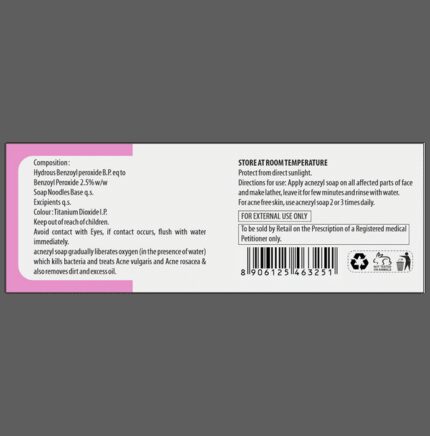 Acnezyl Soap is an anti-bacterial medicine that helps treat acne. Acne appears as spots or pimples on your face, chest, or back. This medicine works by killing acne-causing bacteria. Acnezyl Soap may be used alone or with other acne treatments. You should use it as advised by your doctor. Follow the instructions provided in the product leaflet to get the most out of this medicine. Wash and dry the affected area before medicine application. It is usually used once or twice a day. Do not apply it to damaged or broken skin and avoid contact with your mouth, eyes, and nose. It may take several weeks for your symptoms to improve, keep using it as advised. Consult your doctor after a month of regular use of this medicine, if your condition is not improving.Acnezyl Soap has some common side effects including itching, stinging, peeling, and redness of the skin. They are not usually serious but tell your doctor if they bother you or do not go away. You may need to apply a smaller amount or use it less often. This medicine can make you more sensitive to sunlight. While using it, try to avoid exposure to too much sunlight. If this is unavoidable, apply the medicine in the evening. It can also bleach hair and fabrics including clothes so be careful to avoid contact with these.It is a safe medicine, but you should tell your doctor if you have other skin conditions and if you are using any other medicines, especially those applied to the skin. It may not be suitable if you have very sensitive skin. Ask your doctor about using this medicine if you are pregnant or breastfeeding.