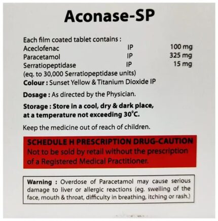 Aconase-SP Tablet is a combination medicine used to relieve pain and swelling in various conditions like muscle pain, joint pain, and postoperative pain. Thus, it effectively alleviates pain and inflammation in conditions like rheumatoid arthritis, ankylosing spondylitis, and osteoarthritis. Aconase-SP Tablet should be taken in the dose and duration as advised by your doctor. It should be taken with food or milk to prevent stomach upset. Taking the medicine regularly at the right times increases its effectiveness. It is important to keep taking the medicine regularly until your doctor tells you it is safe to stop.Nausea, vomiting, stomach pain, indigestion, heartburn, increased liver enzymes, dizziness,drowsiness, and diarrhea are some of the common side effects that might be observed on taking this medicine. Your doctor may regularly monitor your kidney function, liver function, and levels of blood components if you are taking this medicine for long-term treatment. Long-term use may lead to serious complications such as stomach bleeding and kidney problems. Aconase-SP Tablet is not recommended if you are pregnant or breastfeeding.