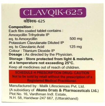 In Treatment of Bacterial infections Clavqik 625 Tablet contains two medicines, Amoxycillin and Clavulanic Acid, that work together to kill the bacteria that cause infections. Amoxycillin works by stopping the growth of bacteria. Clavulanic Acid reduces resistance and enhances the activity of Amoxycillin against bacteria.u003cbr>Clavqik 625 Tablet can treat many bacterial infections such as ear, sinus, throat, lung, urinary tract, skin, teeth, joints, and bones. It usually makes you feel better within a few days, but you should continue taking it as prescribed even when you feel better to ensure all bacteria are killed and do not become resistant.
