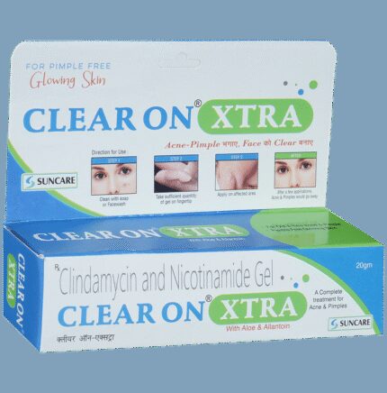 In Treatment of Acne Clear ON Xtra Gel is a combination medicine that helps treat acne (commonly called pimples) by reducing the production of excessive oil in the skin that causes acne. This also kills acne-causing bacteria and prevents spots or pimples from appearing. It usually takes a few weeks to have a noticeable effect so keep using it even if it appears not to be working. Sometimes acne may get worse before it gets better, however, with proper use, your skin will get clearer. The earlier you start using it, the less likely you are to get scars. This medicine will help improve your mood and uplift your confidence as your skin becomes acne-free.