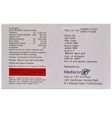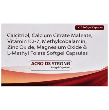 Acro D3 Strong Softgel Capsule is a combination of medicines that is used to treat nutritional deficiencies. It helps in proper growth and development of cells, bone and improves heart health. It also helps in protein synthesis and production of blood cells like red blood cells or white blood cells and boosts immunity. Acro D3 Strong Softgel Capsule may be taken with or without food. It should be used in the dose and duration as prescribed by your doctor. It is advised to take this medicine at a fixed time.This medicine should not be taken more than the recommended dose. It is usually a safe medicine with very minimal or no side effects. However, if you experience severe diarrhea, vomiting, or constipation, you should consult your doctor without delay.Before taking this medicine, tell your doctor if you have any other health conditions. Inform your doctor if you are taking any other medicines or if you are pregnant or breastfeeding.