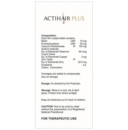 Actihair Plus Tablet is a combination of vitamins and mineral supplements prescribed to treat vitamin and other nutritional deficiencies. It ensures the proper growth and functioning of the body. Actihair Plus Tablet may be taken with or without food. It should be used in the dose and duration prescribed by your doctor. It is advised to take this medicine at a fixed time to avoid missing a dose.Actihair Plus Tablet is usually a safe medicine with very minimal or no side effects. However, if you experience severe diarrhea, vomiting, or constipation, consult your doctor without delay.Before taking this medicine, tell your doctor if you have other health conditions. Inform them if you are taking other medicines or are pregnant or breastfeeding. It is advised not to take alcohol after taking this medicine.
